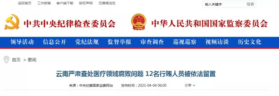 近期(4月4日),中央紀(jì)委國(guó)家監(jiān)委網(wǎng)站發(fā)布了一則信息:《云南嚴(yán)肅查處醫(yī)療領(lǐng)域腐敗問題 12名行賄人員被依法留置》!