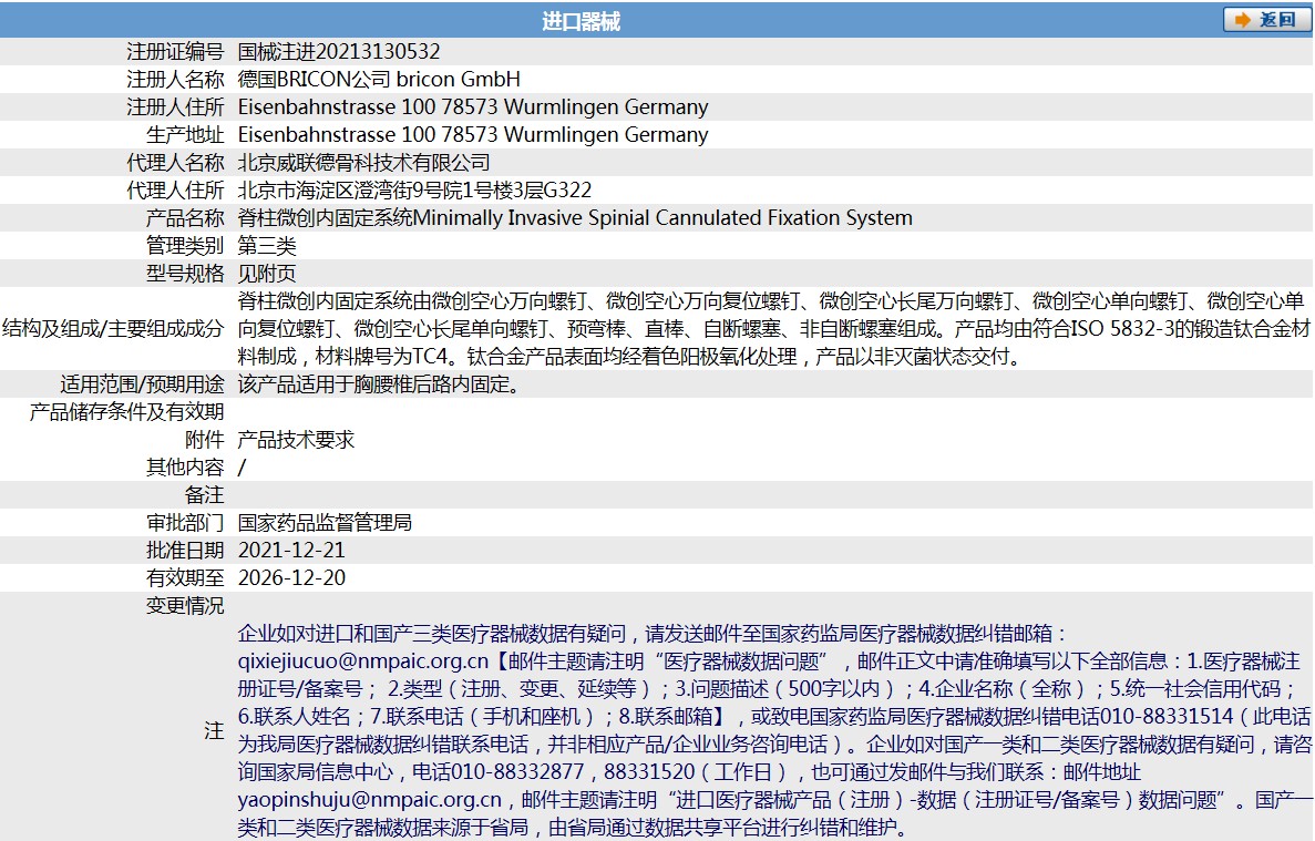 脊柱微創(chuàng)內(nèi)固定系統(tǒng)由微創(chuàng)空心萬(wàn)向螺釘、微創(chuàng)空心萬(wàn)向復(fù)位螺釘、微創(chuàng)空心長(zhǎng)尾萬(wàn)向螺釘、微創(chuàng)空心單向螺釘、微創(chuàng)空心單向復(fù)位螺釘、微創(chuàng)空心長(zhǎng)尾單向螺釘、預(yù)彎棒、直棒、自斷螺塞、非自斷螺塞組成。產(chǎn)品均由符合ISO 5832-3的鍛造鈦合金材料制成,材料牌號(hào)為TC4。鈦合金產(chǎn)品表面均經(jīng)著色陽(yáng)極氧化處理,產(chǎn)品以非滅菌狀態(tài)交付。產(chǎn)品適用于胸腰椎后路內(nèi)固定。