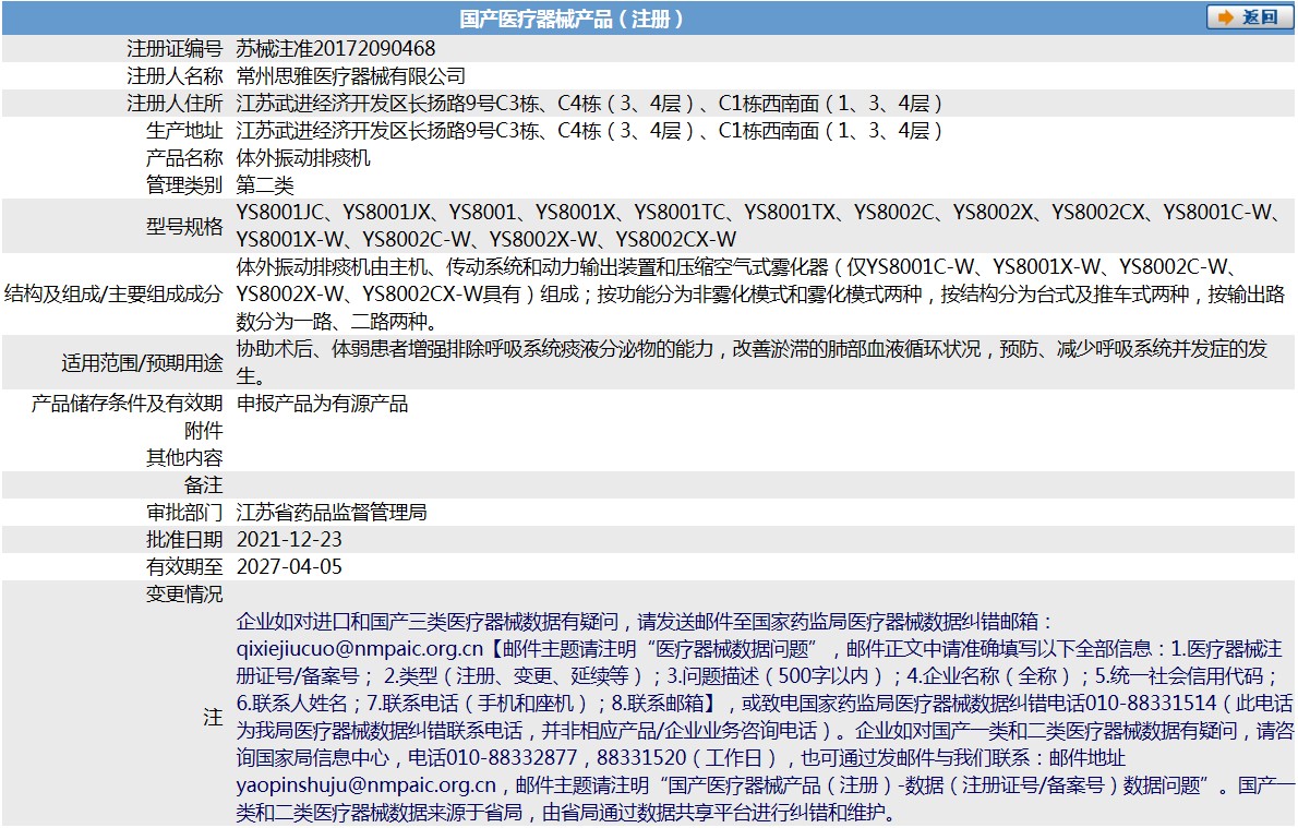 體外振動(dòng)排痰機(jī)由主機(jī)、傳動(dòng)系統(tǒng)和動(dòng)力輸出裝置和壓縮空氣式霧化器(僅YS8001C-W、YS8001X-W、YS8002C-W、YS8002X-W、YS8002CX-W具有)組成;按功能分為非霧化模式和霧化模式兩種,按結(jié)構(gòu)分為臺(tái)式及推車式兩種,按輸出路數(shù)分為***路、二路兩種。