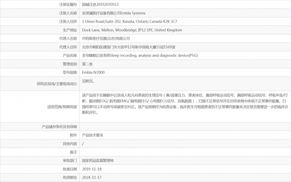 產(chǎn)品用于在睡眠中記錄成人和兒科患者的生理信號(hào)(鼻/面罩壓力、患者體位、腹部呼吸運(yùn)動(dòng)信號(hào)、胸部呼吸運(yùn)動(dòng)信號(hào)、呼吸聲音/打鼾、眼動(dòng)圖EOG/ 肌電圖EMG/ 腦電圖EEG/ 心電圖ECG信號(hào)、血氧數(shù)據(jù)),掃描不正常信號(hào)并在總結(jié)表格中體現(xiàn)不正常事件數(shù)量。掃描結(jié)果可以手動(dòng)改寫(xiě)或被醫(yī)生糾正。該產(chǎn)品預(yù)期作為檢查設(shè)備,臨床醫(yī)生可根據(jù)患者的不正常事件數(shù)量來(lái)決定是否需要進(jìn)***步的臨床診斷和評(píng)價(jià)。