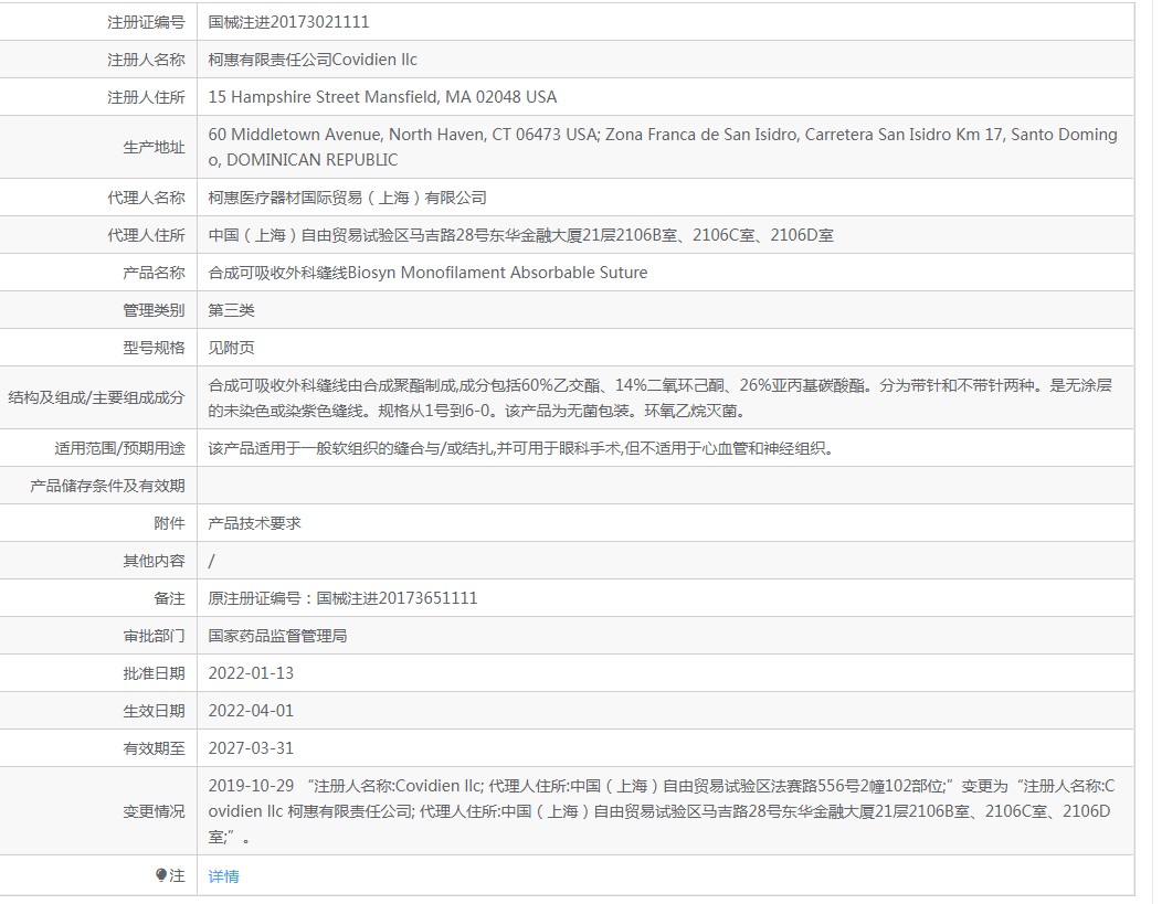 材質(zhì)為乙交酯和丙交酯的共聚物,是多股編織涂層,未染色或經(jīng)D&C紫色2號染色劑染為紫色的縫線,分為帶針和不帶針兩種,規(guī)格從2到8-0。涂層材質(zhì)為乙交酯/己內(nèi)酯共聚物和乳酸硬脂酸鈣的混合物。