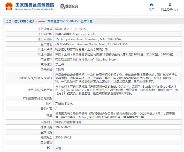 與本公司生產(chǎn)的已獲批準(zhǔn)且適用范圍***致的Endo GIA釘匣、采用Tri-Staple技術(shù)的Endo GIA釘匣、Signia Tri-Staple 2.0 帶芯片釘匣/釘倉(cāng)配合使用,用于器官、組織的切除、橫斷和吻合。也可用于肝臟實(shí)質(zhì)、肝臟血管、膽管結(jié)構(gòu)和胰腺的橫斷和切除。