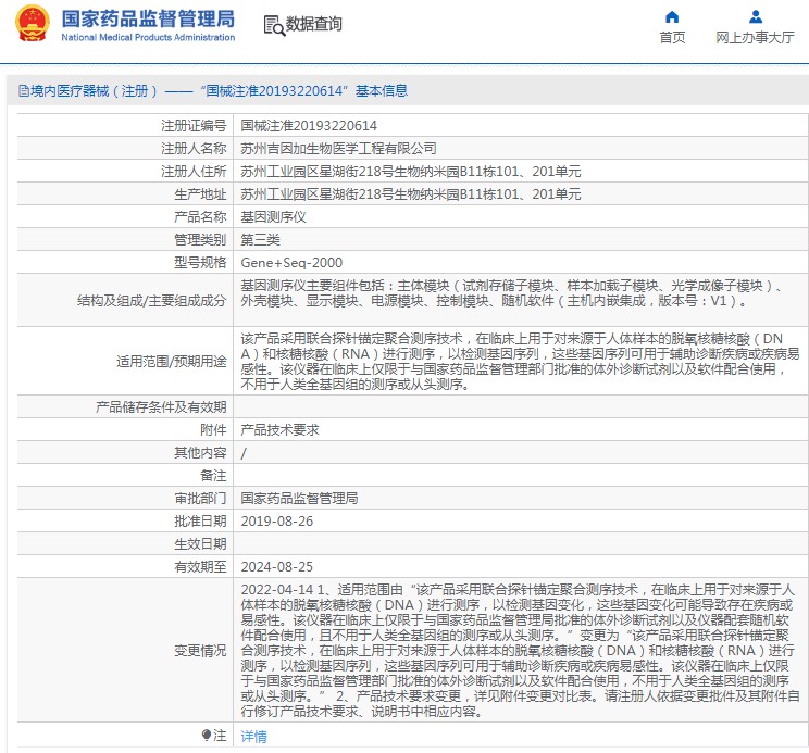 該產(chǎn)品采用聯(lián)合探針錨定聚合測序技術(shù),在臨床上用于對來源于人體樣本的脫氧核糖核酸(DNA)和核糖核酸(RNA)進(jìn)行測序,以檢測基因序列,這些基因序列可用于輔助診斷疾病或疾病易感性。