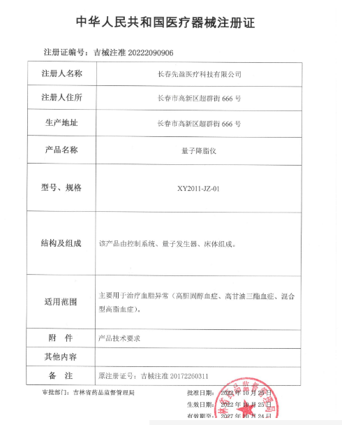 量子降脂儀系******科技部立項支持科技成果轉(zhuǎn)化產(chǎn)品,具有完全的自主知識產(chǎn)權(quán),已獲得多項*********。 產(chǎn)品列入******工信部“***臺(套)重大技術(shù)裝備推廣應(yīng)用指導(dǎo)目錄”,系單***來源產(chǎn)品。 經(jīng)驗證,量子降脂儀能夠延長端粒的長度,及提高血清和肝臟中 SOD、GSH-Px 和 CAT 抗氧化酶活性。降低機(jī)體的老化程度,發(fā)揮其抗衰老作用。 量子降脂治療 吉林省醫(yī)保乙類收費項目 收費編碼340100028