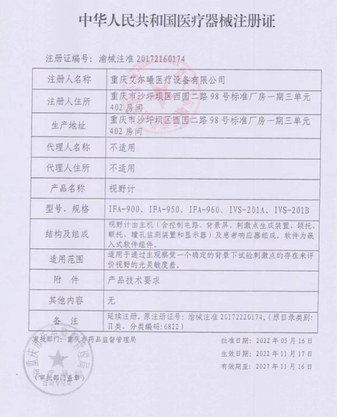 結(jié)構(gòu)及組成/主要組成成分 由主機(含控制電路、背景屏、刺激點生成裝置、頜托、額托、瞳孔監(jiān)測裝置和顯示器)及患者響應(yīng)器組成。軟件為嵌入式軟件組件。 適用范圍/預(yù)期用途 適用于通過主觀察覺***個確定的背景下試驗刺激點的存在來評價視野的光靈敏度差。