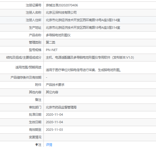 注冊證編號 京械注準(zhǔn)20202070406 注冊人名稱 北京云深科技有限公司 注冊人住所 北京市北京經(jīng)濟(jì)技術(shù)開發(fā)區(qū)西環(huán)南路18號A座3層314室 生產(chǎn)地址 北京市北京經(jīng)濟(jì)技術(shù)開發(fā)區(qū)西環(huán)南路18號A座3層314室 產(chǎn)品名稱 多導(dǎo)腦電地形圖儀 管理類別 第二類 型號規(guī)格 PN-NET 結(jié)構(gòu)及組成/主要組成成分 主機(jī)、電源適配器及多導(dǎo)腦電地形圖儀***軟件(發(fā)布版本:V1.0) 適用范圍/預(yù)期用途 適用于醫(yī)療單位對腦電信號進(jìn)行采集,生成腦電地形圖。 產(chǎn)品儲存條件及有效期 - 附件 產(chǎn)品技術(shù)要求 其他內(nèi)容 其它內(nèi)容 備注 審批部門 北京市藥品監(jiān)督管理局。