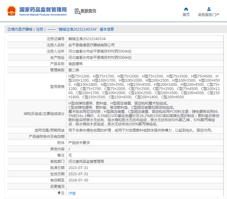 魔術(shù)貼采用尼龍材質(zhì);H型固定裝置、C型固定裝置、固定鉤采用PC材料注塑;彈性繃帶采用69.5%的16s-1棉紗、4.3%的210D氨綸包覆紗及26.2%的150D滌綸高彈絲混紡制成;敷料墊及移動(dòng)敷料墊采用親水無(wú)紡布、吸水棉和拒水無(wú)紡布組成,親水無(wú)紡布由50%聚乙烯,50%聚丙烯組成,吸水棉由木漿組成,拒水無(wú)紡布由100%聚丙烯組成。