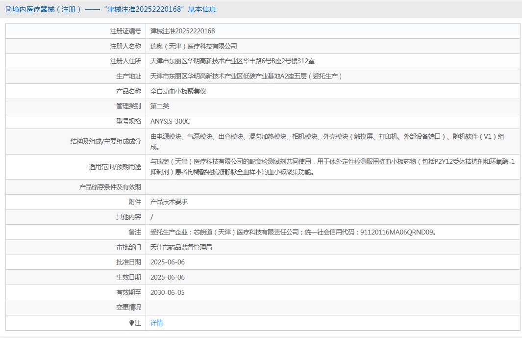 適用范圍/預(yù)期用途:與瑞奧(天津)醫(yī)療科技有限公司的配套檢測(cè)試劑共同使用,用于體外定性檢測(cè)服用抗血小板藥物(包括P2Y12受體拮抗劑和環(huán)氧酶-1抑制劑)患者枸櫞酸鈉抗凝靜脈全血樣本的血小板聚集功能。