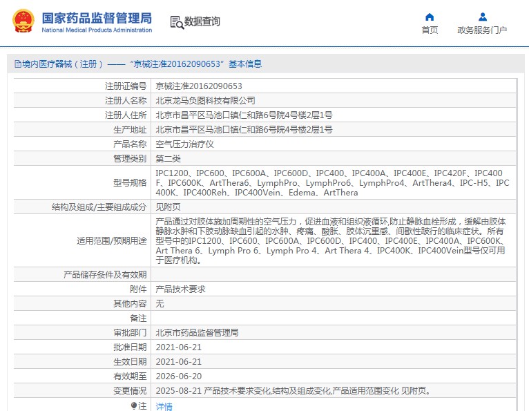 產(chǎn)品通過對肢體施加周期性的空氣壓力,促進(jìn)血液和組織液循環(huán),防止靜脈血栓形成,緩解由肢體靜脈水腫和下肢動脈缺血引起的水腫、疼痛、酸脹、肢體沉重感、間歇性跛行的臨床癥狀。所有型號中的IPC1200、IPC600、IPC600A、IPC600D、IPC400、IPC400E、IPC400A、IPC600K、Art Thera 6、Lymph Pro 6、Lymph Pro 4、Art Thera 4、IPC400K、IPC400Vein型號僅可用于醫(yī)療機(jī)構(gòu)。