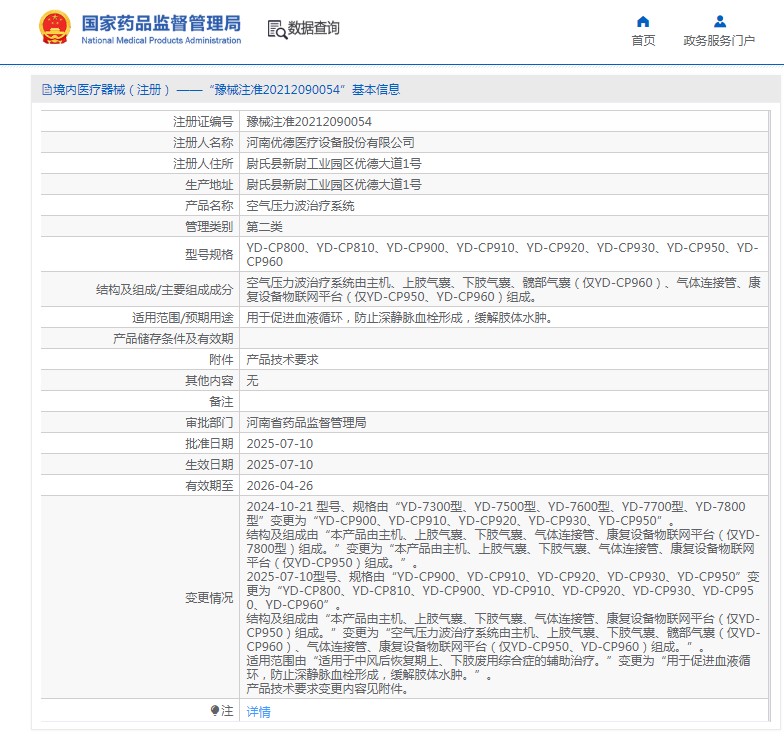 空氣壓力波治療系統(tǒng)由主機(jī)、上肢氣囊、下肢氣囊、髖部氣囊(僅YD-CP960)、氣體連接管、康復(fù)設(shè)備物聯(lián)網(wǎng)平臺(tái)(僅YD-CP950、YD-CP960)組成。