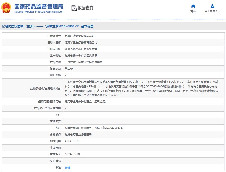 ***次性使用全麻氣管插管麻醉包基本配置為氣管插管(PVC材料)、***次性使用吸痰管(PVC材料)、***次性使用連接導(dǎo)管(PVC材料)、球囊充起器(PP材料)、***次性使用滅菌橡膠外科手套(符合GB 7543-2006標(biāo)準(zhǔn)的乳膠材料)、紗布塊(醫(yī)用脫脂紗布材料)、石蠟棉球(醫(yī)用)、方巾(非織造布材料)組成,選用配置:***次性使用口咽通氣道、咬口、牙墊、***次性使用喉鏡窺視片、膠布、導(dǎo)引絲。產(chǎn)品經(jīng)環(huán)氧乙烷滅菌,應(yīng)無菌。